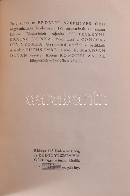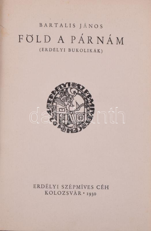 Bartalis János: Föld a párnám. (Erdélyi bukolikák.) Litteckyné Krausz Ilonka illusztrációival. Erdélyi Szépmíves Céh 46. sz. kiadványa. Kolozsvár, 1930., Erdélyi Szépmíves Céh, (Concordia-ny.),89+5+VI (Erdélyi Szépmíves Céh tagjainak névsora) p. +3 t. 1. kiadás. Számozott, 208. számú példány. Az Erdélyi Szépmíves Céh "Dr. Missák István" számára szóló ex libris-szével. Kiadói félbőrkötés, Rohonyi Antal-kötés, kopott borítóval.