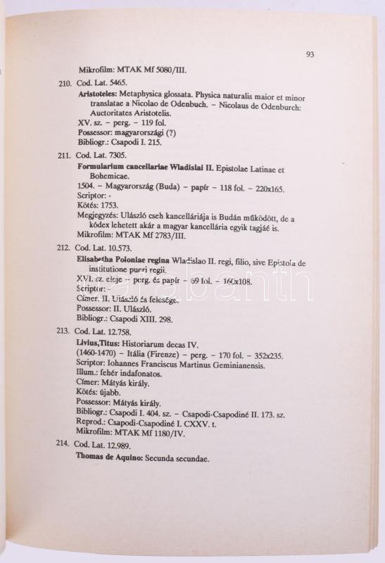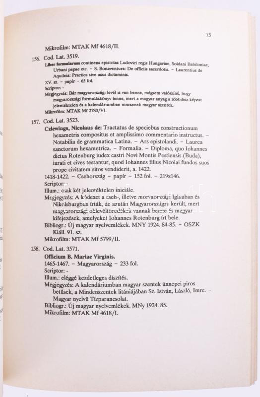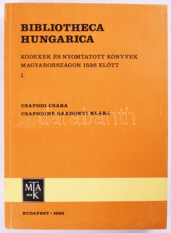 Csapodi Csaba - Csapodiné Gárdonyi Klára: Bibliotheca Hungarica. Kódexek és nyomtatott könyvek Magyarországon 1526 előtt. I. köt. Fönnmaradt kötetek: 1. A-J. Bp., 1988, MTAK, [6]+447+[7] p. Kiadói papírkötés. Megjelent 800 példányban.