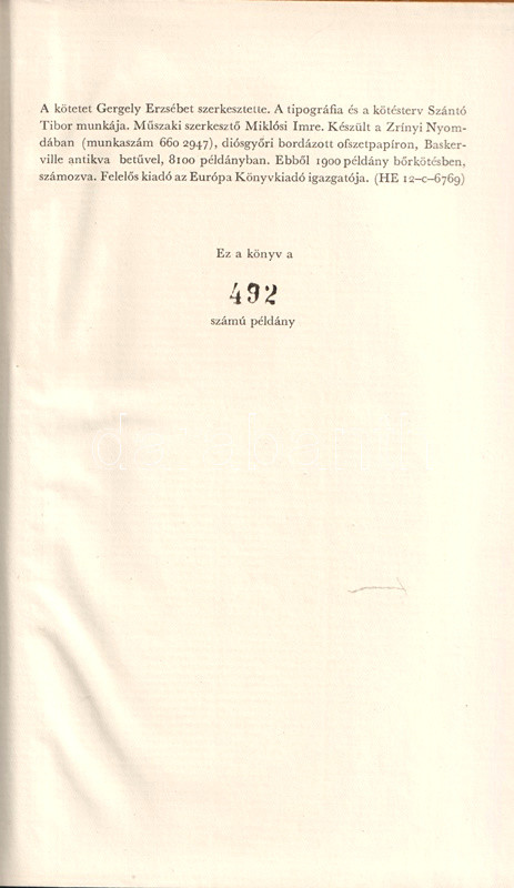 Kolofon: "A kötetet Gergely Erzsébet szerkesztette. A tipográfia és a kötésterv Szántó Tibor munkája. Készült a Zrínyi Nyomdában, diósgyőri bordázott ofszetpapíron, Baskerville antikva betűvel, 8100 példányban. Ebből 1900 példány bőrkötésben, számozva. Ez a könyv a 492. számú példány".