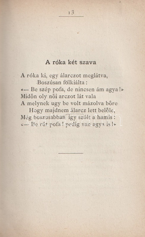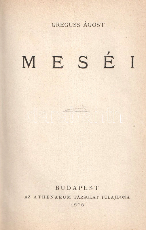 Greguss Ágost (1825-1882) műfordító, hírlapíró, szerkesztő, egyetemi tanár, esztéta, az első rendszeres magyar esztétikai mű szerzője, a Kisfaludy-Társaság és a Magyar Tudományos Akadémia tagja. Pályája végén írt verses meséi részben La Fontaine nyomában járó állatmesék, részben kortárs társadalmi típusok, karrierpályák verses karikatúrái. A munkából párhuzamosan két kiadás is megjelent, az ifjúság számára készült kiadás a szatirikus verseket elhagyja. Példányunk a felnőtt olvasóközönség részére szánt, bővebb változatból való.