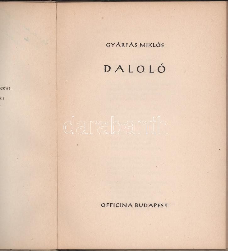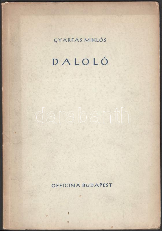 Gyárfás Miklós: Daloló. [Versek.] A szerző, Gyárfás Miklós (1915-1992) drámaíró, főiskolai tanár által ifj. Ambrózy Ágoston (1914-1998) költő, író által DEDIKÁLT példány! Bp., 1942., Officina, 46+2 p. Első kiadás! Kiadói papírkötés.