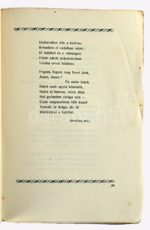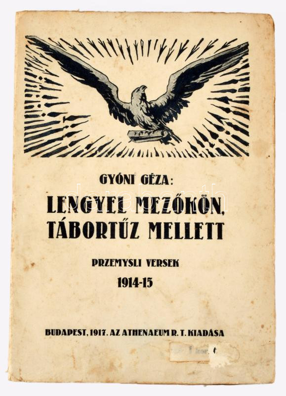 Gyóni Géza: Lengyel mezÅ‘kön, tábortűz mellett. Przemysli versek. 1914-15. Bp., 1917, Athenaeum, 76 p. 4. kiadás. Kiadói papÃrkötés, foltos borÃtóval, a könyv gerince elvált a borÃtótól, de a könyvtest egyben van.