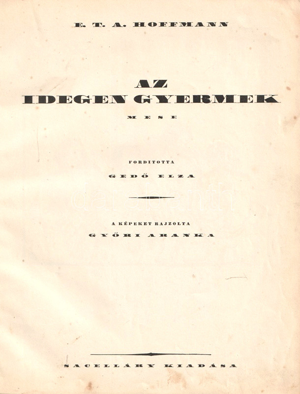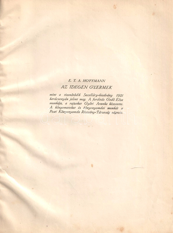 Kolofon: "E. T. A. Hoffmann: Az idegen gyermek, mint a tizenötödik Sacelláry-kiadvány, 1921 karácsonyán jelent meg [. . .]. A kőnyomatokat és a könyvnyomdai munkákat a Pesti Könyvnyomda Rt. végezte".