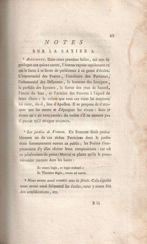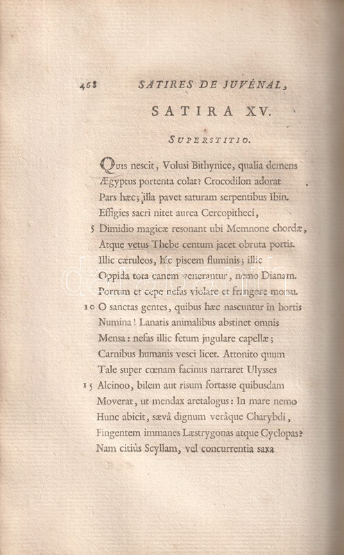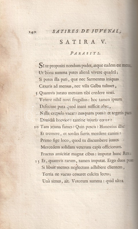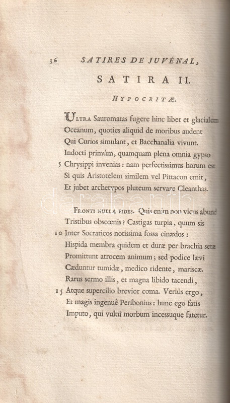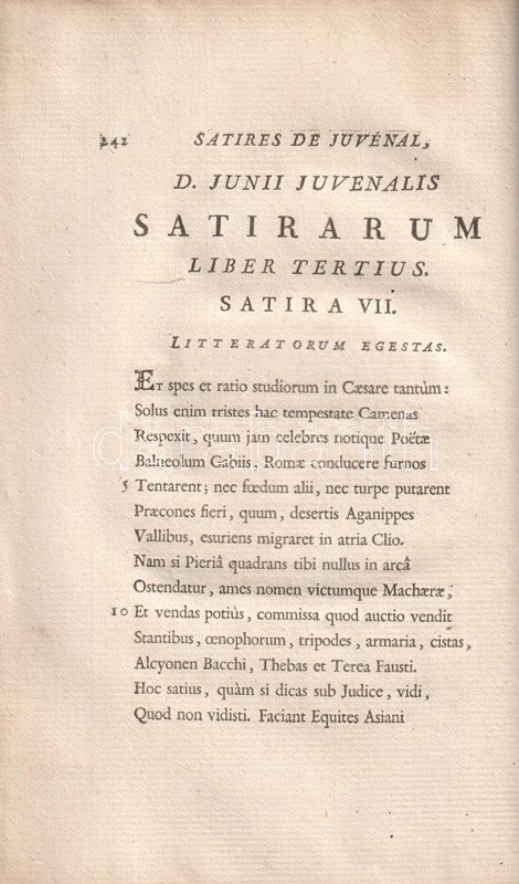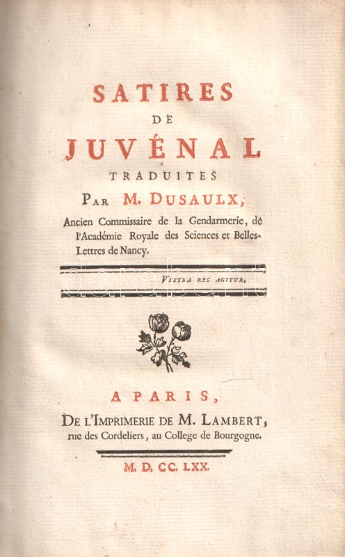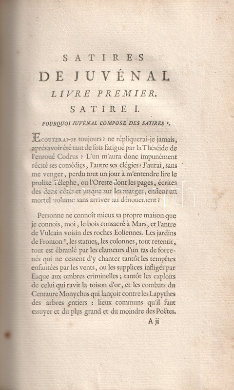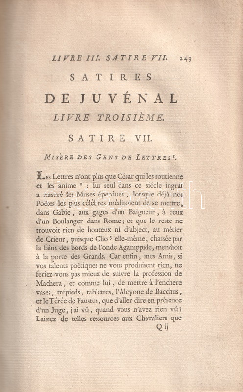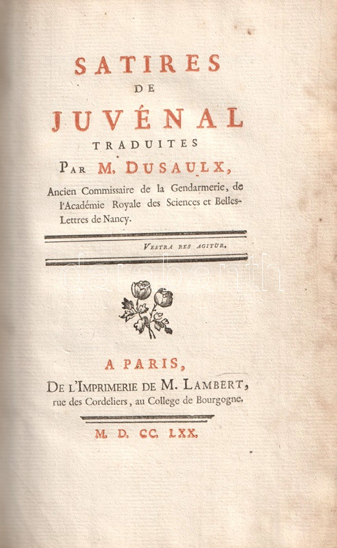 A Római Birodalom mindennapjainak erkölcsi romlásáról Ãrt, társadalomtörténeti szempontból forrásértékűnek tekinthetÅ‘ Juvenalis-szatÃrák Kr. u. 100 és 130 között keletkeztek, a szerzÅ‘ retorikai hÃrnevének köszönhetÅ‘en számos másolatban maradtak fenn, latin szövegkiadásuk a humanisták korától folyamatos. A szatÃragyűjtemény elsÅ‘, részleges verses francia fordÃtása 1544-ben jelent meg, a francia klasszicizmus századában újabb, ezúttal teljes, ám prózai fordÃtása készült, majd Jean Dusaulx (1728-1799), a kalandos pályát bejárt francia ügyvéd, csendÅ‘r és irodalmár fordÃtotta modernebb franciára a jeles római szatirikust, gazdagabb jegyzetanyaggal, de ismételten francia prózában. FordÃtásáért műfordÃtónk elnyerte a francia Akadémia tagságát.