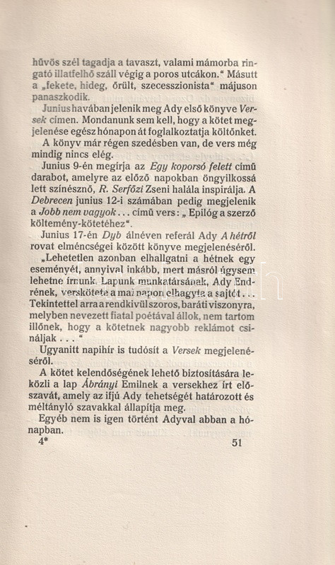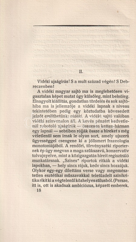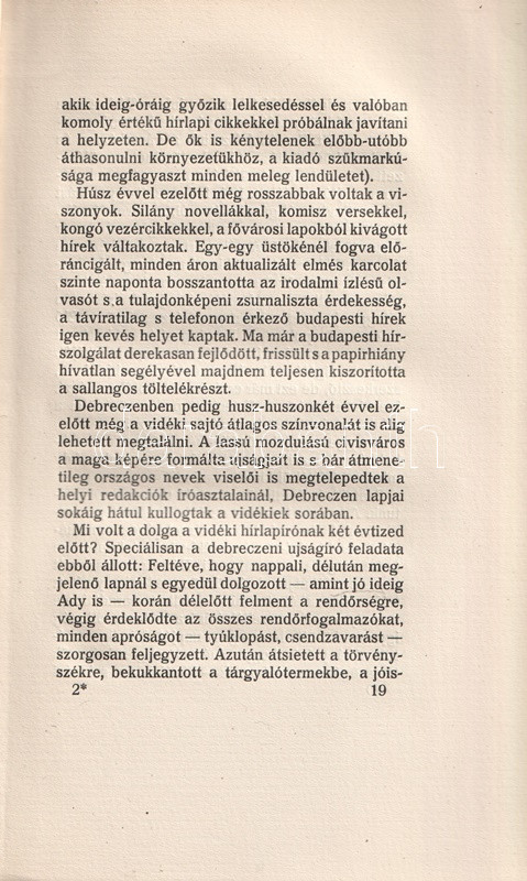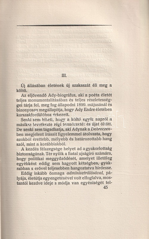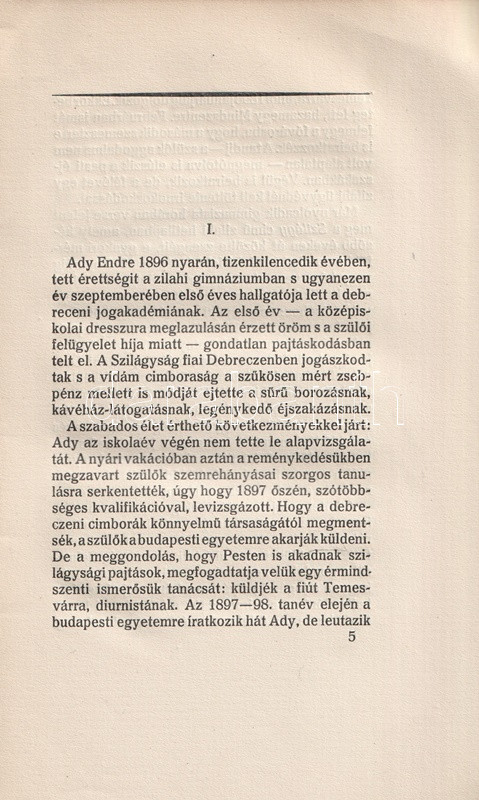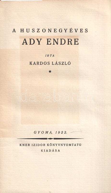 Kardos László (1898-1987) irodalomtörténész sajtótörténeti részletekben gazdag Ady-tanulmánya Ady Endre korai hÃrlapÃrói idÅ‘szakát Debrecen századfordulós szerkesztÅ‘ségi és társasági világába ágyazva idézi meg, számos publikálatlan életrajzi részlettel. A cÃmlap elÅ‘tt a huszonegy éves Ady Endre portréja, az elsÅ‘ nyomtatott oldalon Kozma Lajos Kner-nyomdajegye.