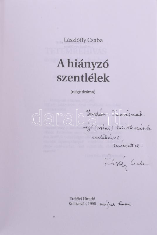 Lászlóffy Csaba: A hiányzó szentlélek. (Négy dráma.) A szerző, Lászlóffy Csaba (1939-2015) József Attila-díjas erdélyi magyar költő, író, műfordító, esszéista által, Jordán Tamás (1943-) a Nemzet Színésze címmel kitüntetett, Kossuth- és Jászai Mari-díjas színész, rendező, színigazgató, érdemes művész, a Halhatatlanok Társulatának örökös tagja részére DEDIKÁLT példány! "Jordán Tamásnak régi (színi) találkozások emlékével, szeretettel: Lászlóffy Csaba. [1998.] május hava]"