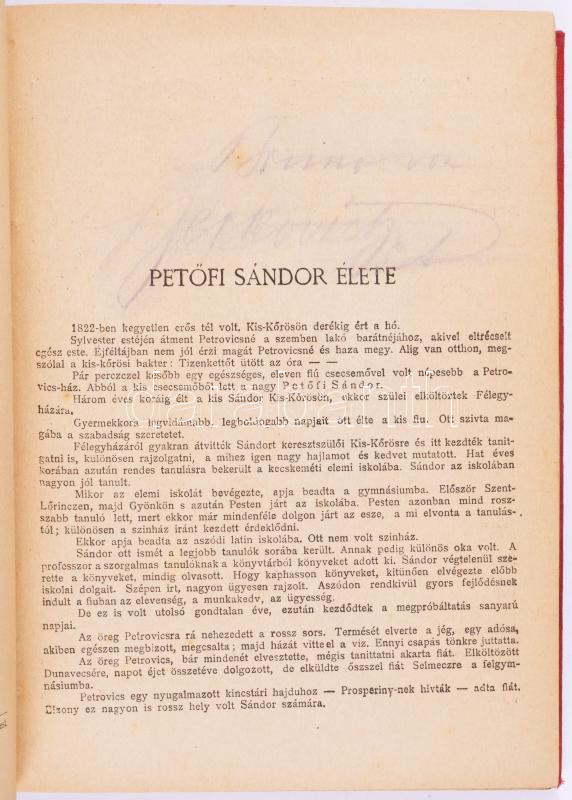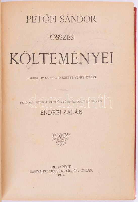 Petőfi Sándor összes költeményei. Eredeti rajzokkal díszített népies kiadás. Sajtó alá rendezte és Petőfi rövid életrajzával ellátta: Endrei Zalán. Bp., 1904, Magyar Kereskedelmi Közlöny, 432 p. Kiadói aranyozott, szecessziós egészvászon-kötés, kissé viseltes borítóval.