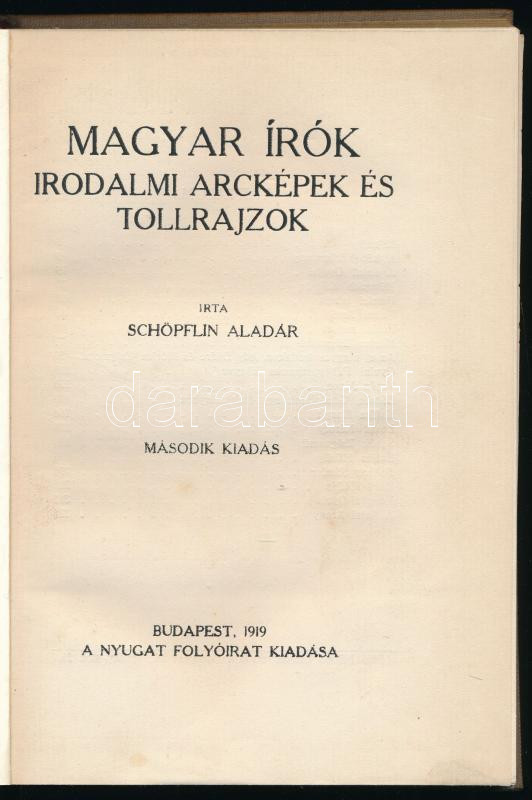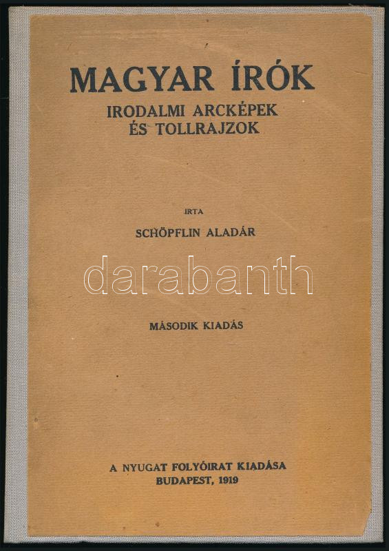 Schöpflin Aladár: Magyar írók. Irodalmi arcképek és tollrajzok. Bp., 1919, Nyugat, 236 p. Második kiadás. Átkötött egészvászon-kötésben, ex libris-szel.