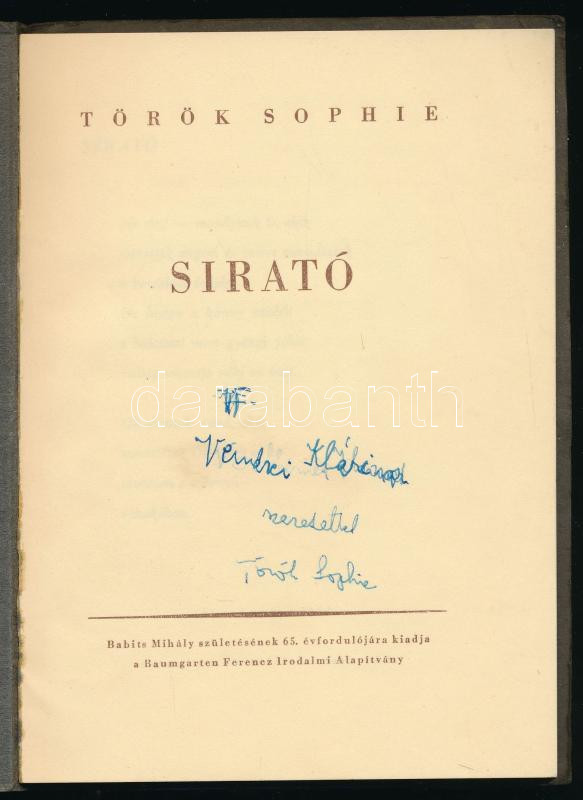 Török Sophie: Sirató. 1948. DEDIKÁLT! Kiadói papírkötés, jó állapotban.
