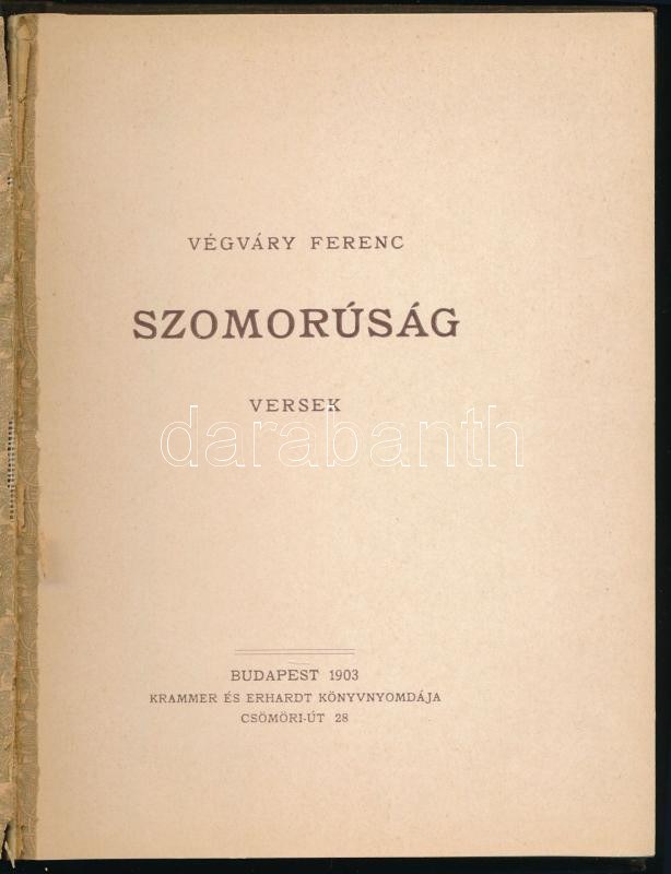 Végváry Ferenc: Szomorúság. Versek. Bp., 1903, Krammer és Erhardt. Kiadói egészvászon kötés, előzéklap kiszakadt, kissé kopottas állapotban + gyűjtőív.