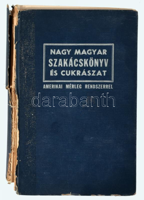 Nagy magyar szakácskönyv és cukrászat. Amerikai viszonyokra alkalmazva. Amerikai suly- és ürmértékekre. New York, 1947, St. Marks Printing Corp., XIII+[1]+338 p. Kiadói egészvászon-kötés, sérült borítóval és gerinccel, a könyvtesttől elváló elülső kötéstáblával.