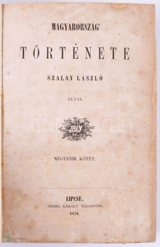 Szalay László: Magyarország' története. IV. köt. Lipcse, 1854, Geibel Károly, X+600 p. Átkötött félvászon-kötés, kopott, foltos borítóval, foltos lapokkal.