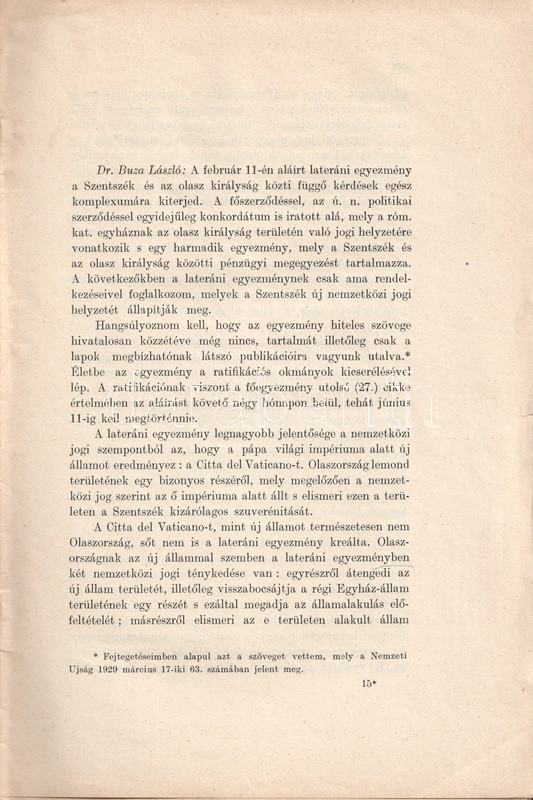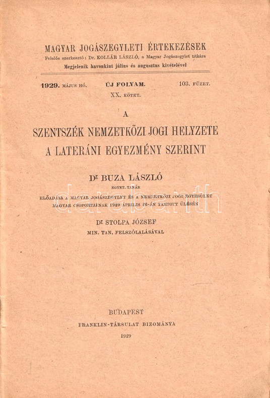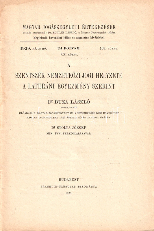 A Szentszék nemzetközi jogi helyzete a lateráni egyezmény szerint. Buza László előadása a Magyar Jogászegylet és a Nemzetközi Jogi Egyesület magyar csoportjának 1929. április 26-án tartott ülésén.