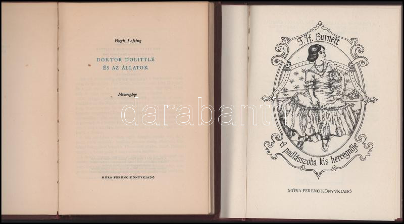 2 db könyv: Hugh Lofting: Doktor Dolittle és az állatok. Meseregény. Ford.: Csánk Endre. Bp., 1958, Móra. Kiadói egészvászon-kötés, kissé viseltes borítóval. + F. H. Burnett: A padlásszoba kis hercegnője. Ford.: Pogány Kázmér. Bp., 1989, Móra. Kiadói kartonált papírkötés.