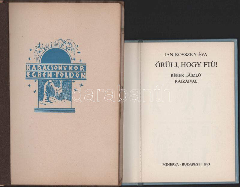 2 db könyv: Karácsonykor égben-földön. Bp., é.n. (cca 1940), Szépmíves Műhely, 23+[1] p. Kiadói félvászon-kötés. + Janikovszky Éva: Örülj, hogy fiú! Réber László rajzaival. Bp., 1983, Minerva. Kiadói kartonált papírkötés.