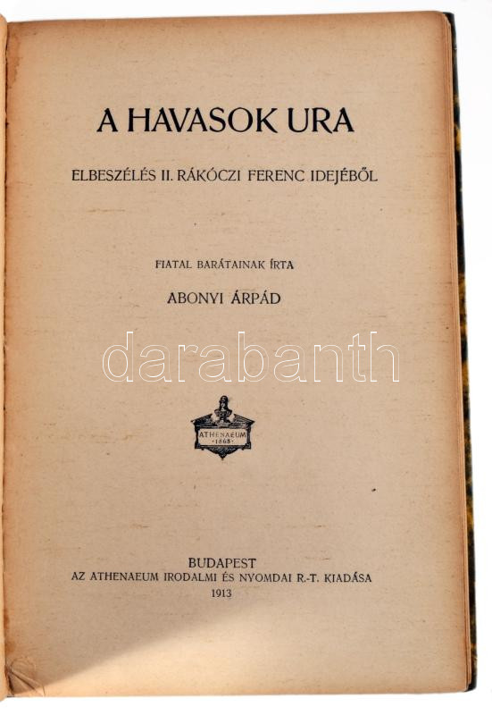 Abonyi Árpád: A történelem hősei. Miklós vitéz. Világverő Mátyás király első ágyúhőse. A havasok ura. Bp., 1913, Athenaeum. Kiadói egészvászon kötés, kopottas állapotban.