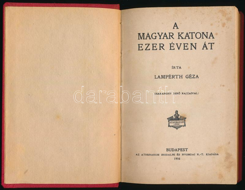 Lampérth Géza: A magyar katona ezer éven át. Haranghy Jenő rajzaival. Bp., 1916., Athenaeum. Átkötött virágmintás egészvászon-kötés, foltos címlappal.