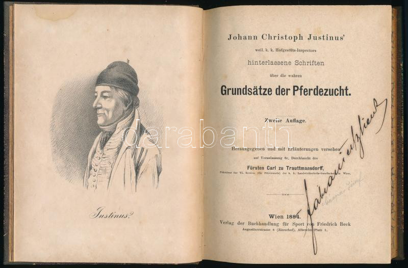 Justinus, Johann Christoph: Hinterlassene Schriften über die wahren Grundsätze der Pferdezucht. Herausgegeben und mit Erläuterungen versehen auf Veranlassung Sr. Durchlaucht des Fürsten Carl zu Trauttmansdorff. Wien, 1884, Friedrich Beck, XII+166+[2] p. Német nyelven. Átkötött félvászon-kötésben, kissé kopottas borítóval, helyenként kissé foltos lapokkal, tulajdonosi névbejegyzéssel.