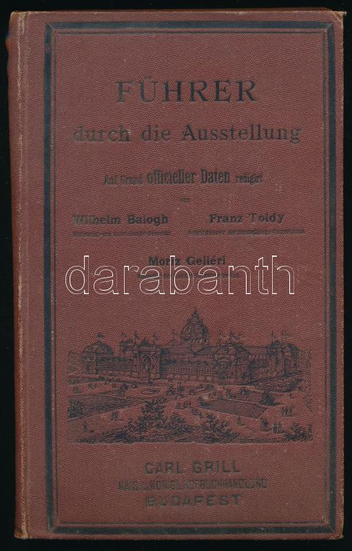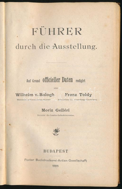 Balogh Vilmos - Toldy Ferenc - Gelléri Mór (szerk.): Führer durch die Ausstellung. Auf Grund officieller Daten redigirt von - - . (Az 1885-ös Budapesti Általános Országos Kiállítás útmutatója.) Bp., 1885, Grill Károly (Pesti Könyvnyomda Rt.), 256+[2] p. + 1 (kihajtható térkép, a kiállítás helyszíne a Városligetben) t. Fekete-fehér illusztrációkkal. Német nyelven. Kiadói egészvászon-kötés, a térképen kisebb szakadással.