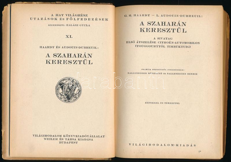 Haardt, [Georges-Marie] - Audouin-Dubreuil, [Louis]: A Szaharán keresztül . A sivatag első átszelése Citroën-automobilon (Touggourttól Timbuktuig). Ford.: Ballenegger Róbertné és Ballenegger Henrik. A hat világrész. Utazások és fölfedezések XI. Bp., [1925], Világirodalom, 202+[6] p.+ 5 t. Első magyar kiadás. Kiadói félvászon-kötés, kissé viseltes, sérült borítóval, belül nagyrészt jó állapotban, intézményi bélyegzővel.