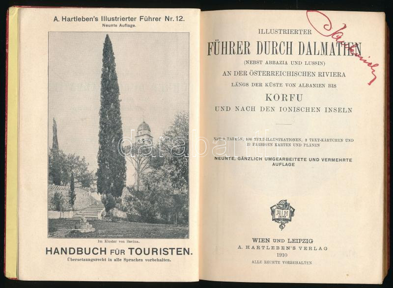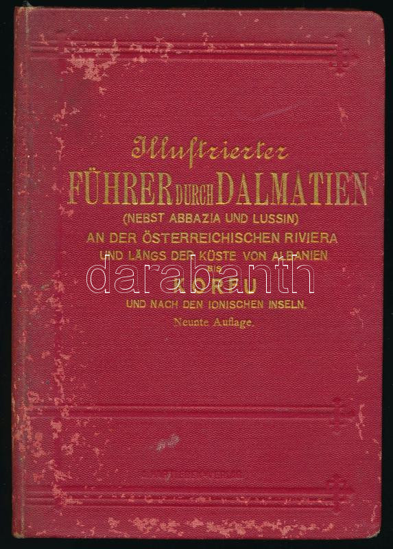 Illustrierter Führer durch Dalmatien. (Nebst Abbazia und Lussin.) An der Österreichischen Riviera längs der Küste von Albanien bis Korfu und nach den Ionischen Inseln. Wien-Leipzig, 1910, A. Hartleben. Fekete-fehér képekkel illusztrálva, számos térképpel. Német nyelven. Kiadói aranyozott egészvászon-kötés, kopottas borítóval, belül a lapok nagyrészt jó állapotban.