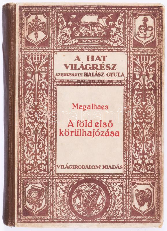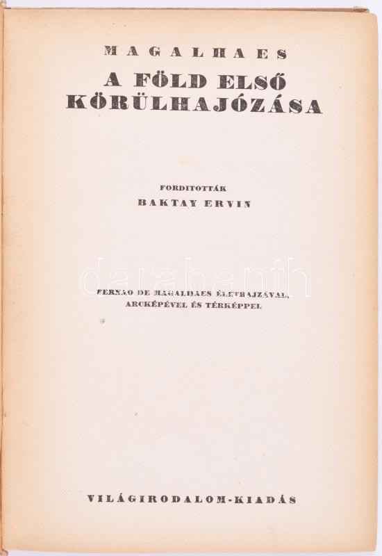 Magalhaes: A Föld első körülhajózása. Ford.: Baktay Ervin. Fernao de Magalhaes életrajzával, arcképével és térképpel. [Ferdinand Magellan.] Ford.: Baktay Ervin. A Hat Világrész. Utazások és Felfedezések XVII. Bp.,[1925],Világirodalom - Weiler és Társa, 159 p.+1 (kétoldalas térkép) t. Kiadói félvászon-kötés, kopott borítóval, laza, kissé sérült kötéssel.