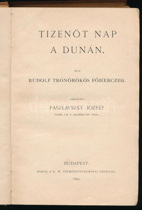 Rudolf trónörökös főherceg: Tizenöt nap a Dunán. Ford.: Paszlavszky József. Bp., 1890, K. M. Természettudományi Társulat, VI+[2]+320 p. Kiadói egészvászon-kötés, koszos borítóval.