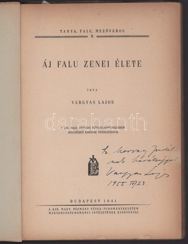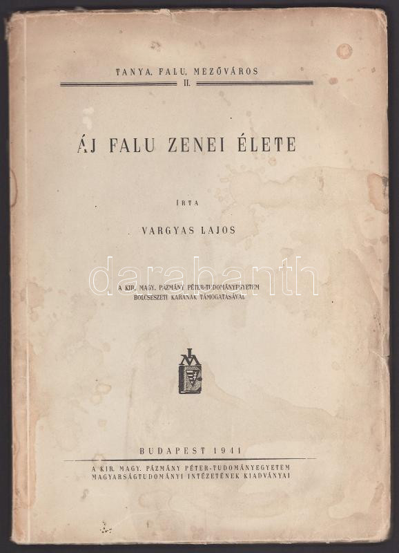 Vargyas Lajos: Áj falu zenei élete Dedikált! /Tanya, falu, mezőváros II./ Bp., 1941. Kir. M. Pázmány P.-Tud.egyetem Magyarságtudományi Int. 93 [3] p. , 29 [3] p. (kotta) Kiadói papírborítóban.