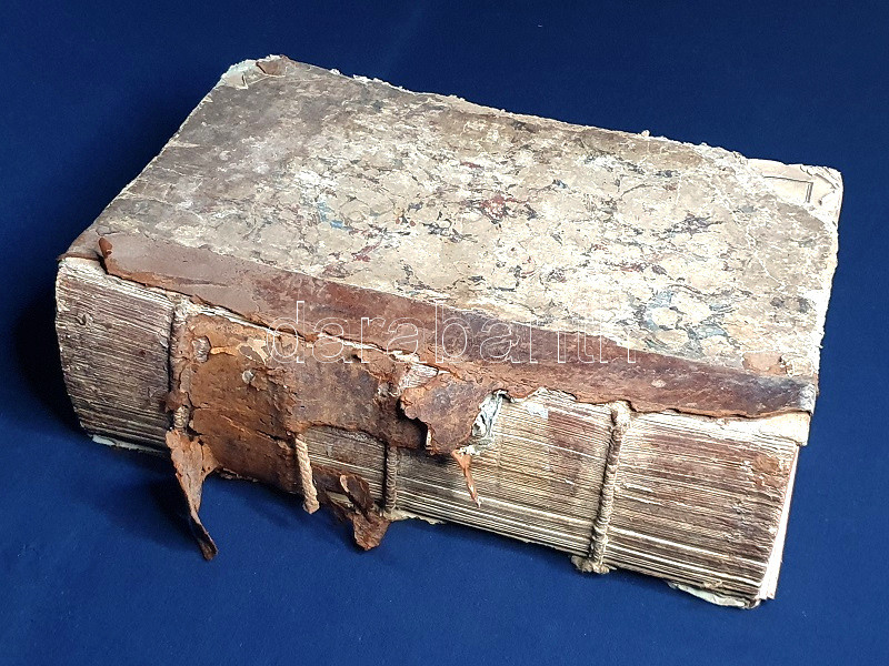 Négy bordára fűzött, hiányos gerincű, sérült, kopott korabeli félbőr kötésben, a kötéstáblák sarkán kisebb hiánnyal, vörös festésű lapszélekkel.