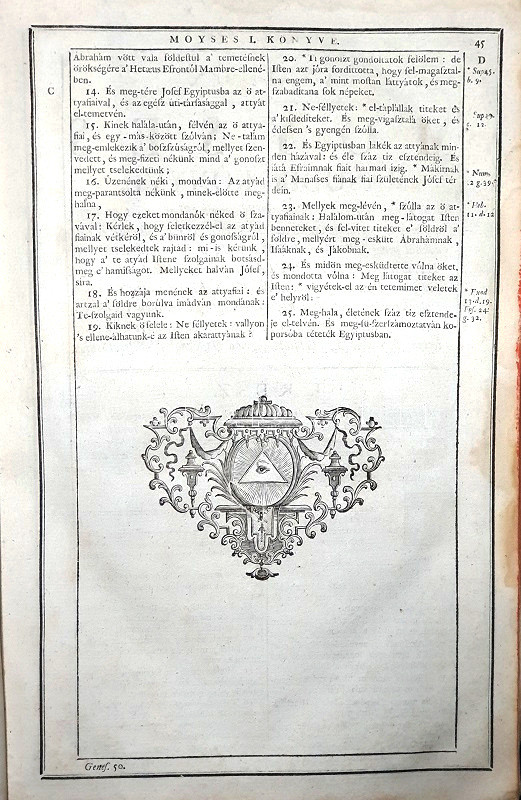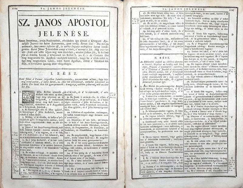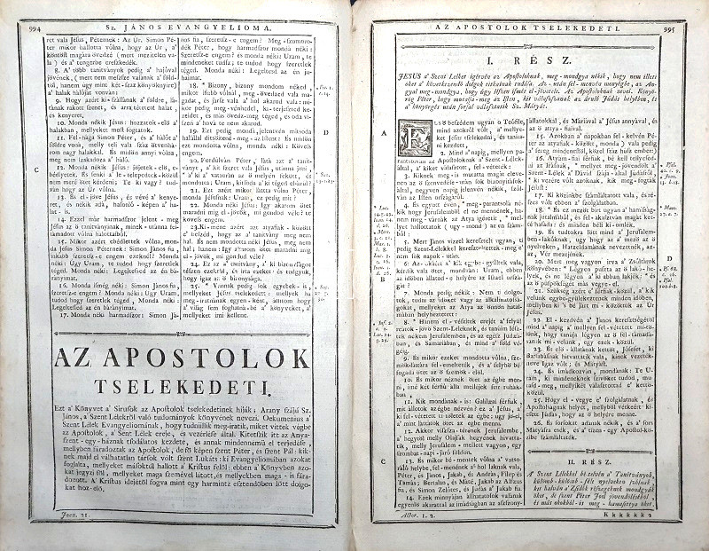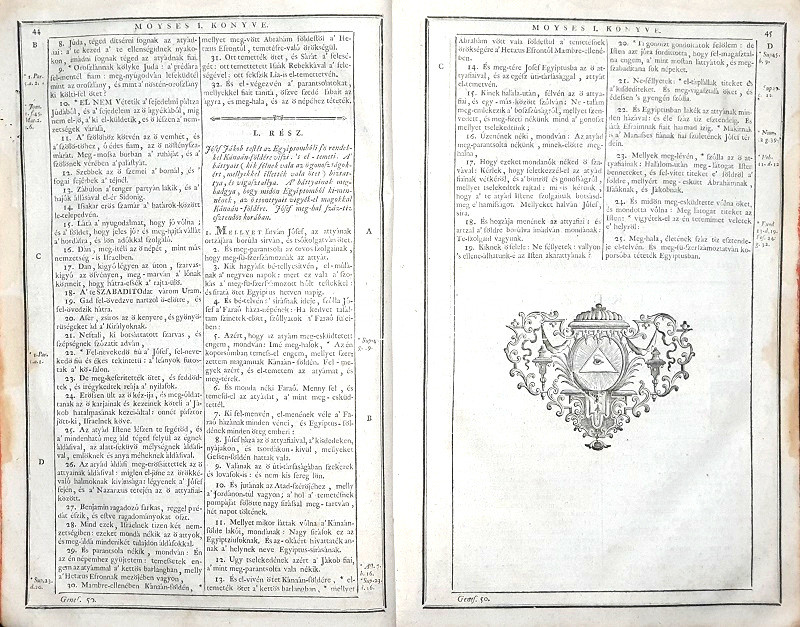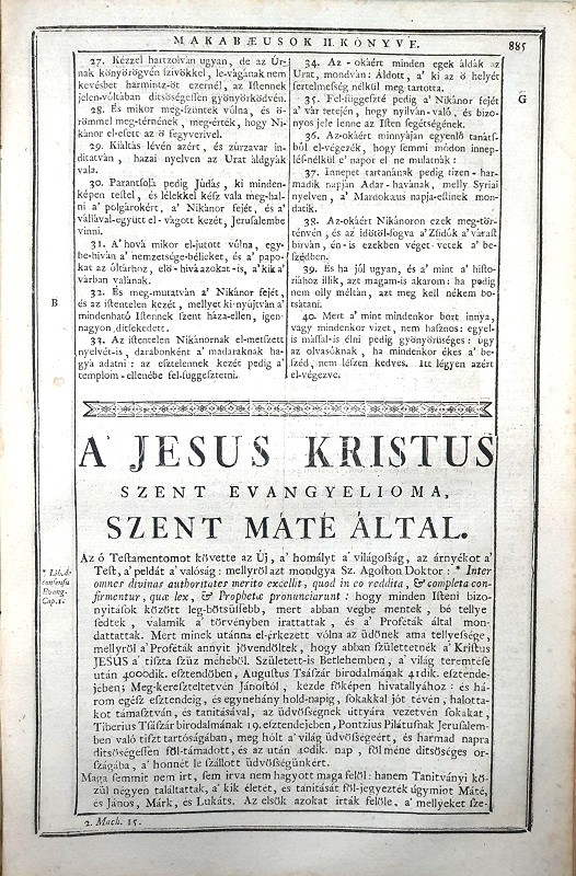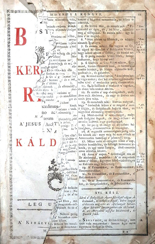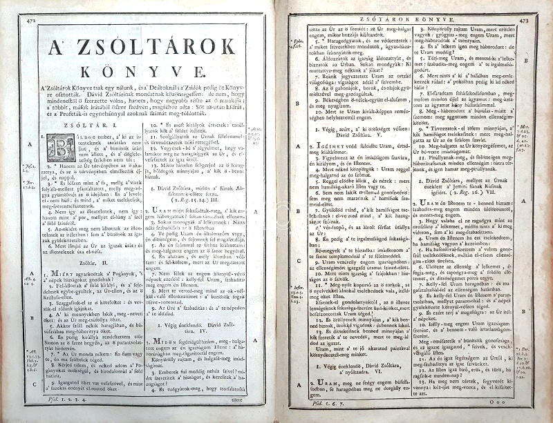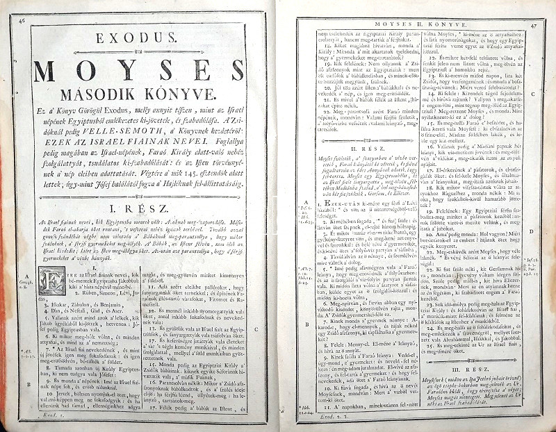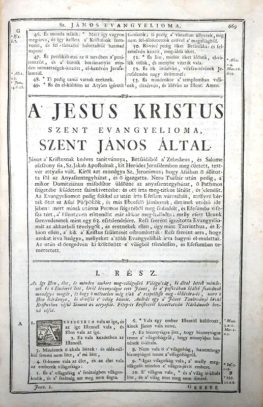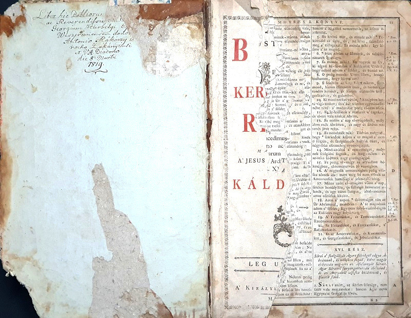Káldi György (1573-1634) nagyszombati jezsuita szerzetes teljes katolikus bibliafordítása 1607-ben készült el, kinyomtatását az 1620-as évek közepén engedélyezte Pázmány Péter esztergomi érsek és Giovanni Argenti jezsuita tartományfőnök. Első kiadása 1626-ban jelent meg, szövege csaknem kétszáz évig nagyrészt változatlan maradt. Példányunk a nagyszombati egyetemmel együtt 1777-ben Budára költöző egyetemi nyomda meghatározó, 1782. évi kiadásából való. Fametszetű könyvdíszekkel, iniciálékkal díszített kiadásunk szövege kéthasábos, keretmintás oldalakon, a könyvek élén bevezetővel, a részek élén összefoglalással, lapszélen elhelyezett bibliai szövegmutatókkal.