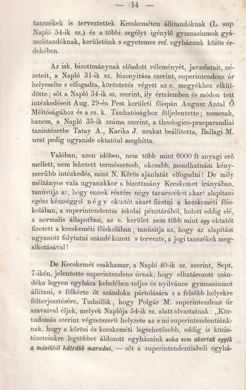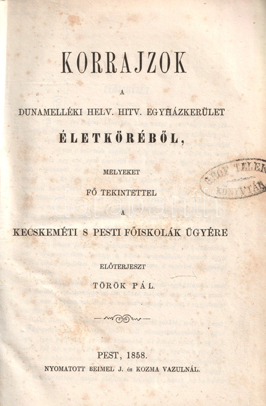 Korrajzok a Dunamelléki Helvét Hitvallású Egyházkerület életköréből, melyeket fő tekintettel a kecskeméti s pesti főiskolák ügyére előterjeszt Török Pál.