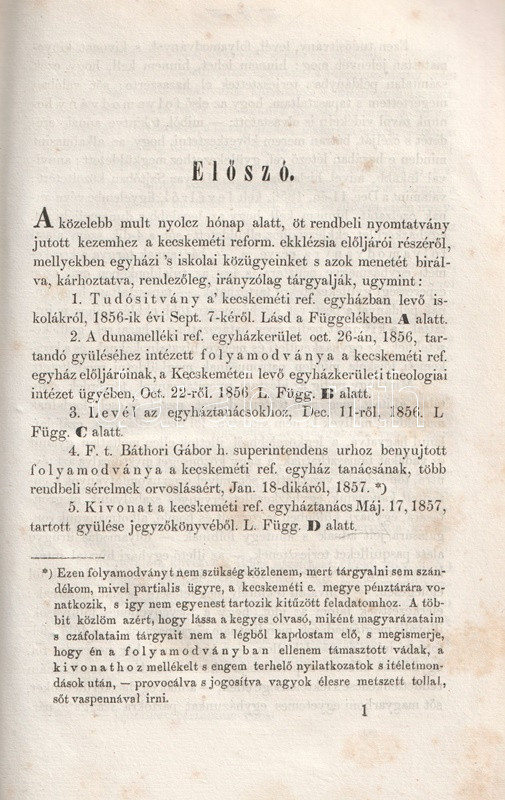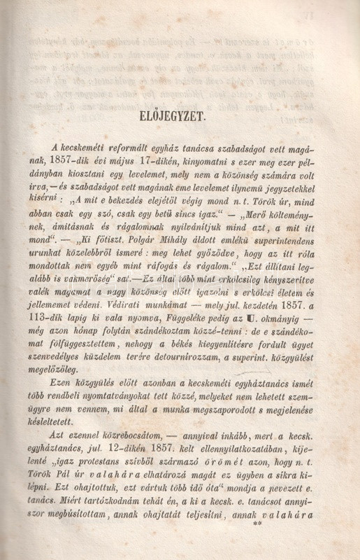 Török Pál (1808-1883) református lelkész, pedagógus, iskolaigazgató, lapszerkesztő, esperes, a protestáns iskolaügy lelkes szervezője. Szenvedélyes hangon fogalmazott, korrajznak is beillő vitairatában a kecskeméti református egyház állításaival vitatkozik: a forráshiányos állapotban élő Dunamelléki református egyházmegye kecskeméti és pesti elöljárói ugyanis másként képzelték el a küszöbön álló protestáns tanügyi fejlesztés részleteit. A bécsi udvarnál is megforduló szerző végül sikeresen végbe vitte reformját, ennek megfelelően Pesten teológiai, Kecskeméten jogi, Nagykőrösön pedig tanárképző főiskola létesült. A kötet függelékében a protestáns tanügyi konfliktus dokumentumai.