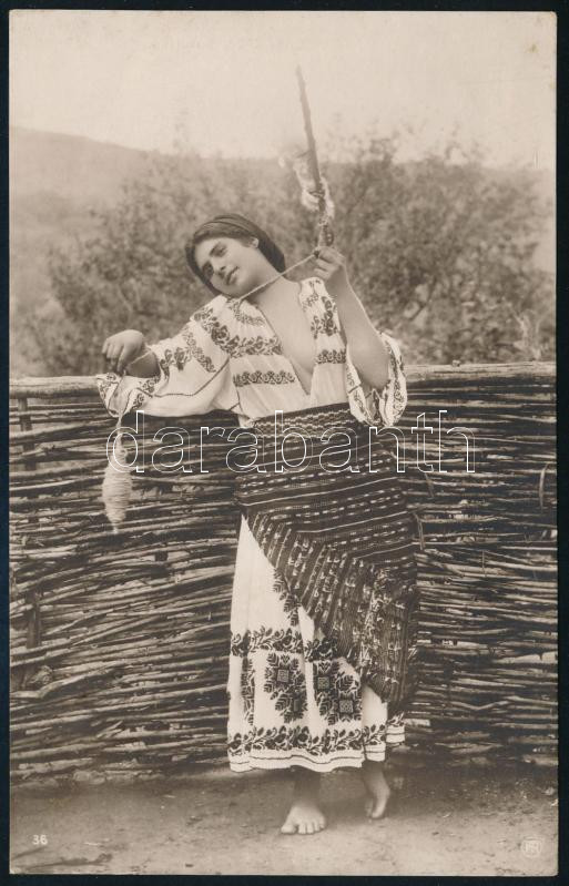 1912 Lány román népviseletben, finoman erotikus fotólap, 13×9 cm