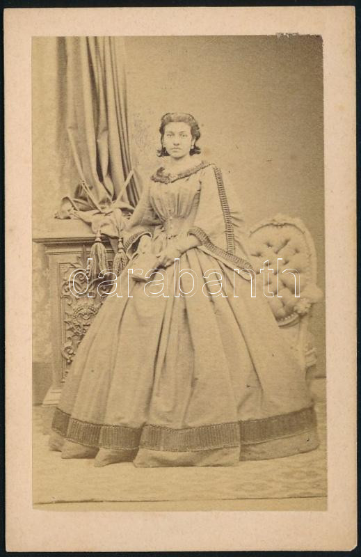 cca 1865 Női portré, keményhátú fotó Knézevits György pécsi műterméből, 10,5×6,5 cm