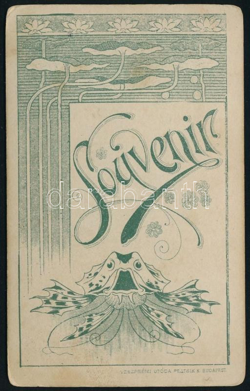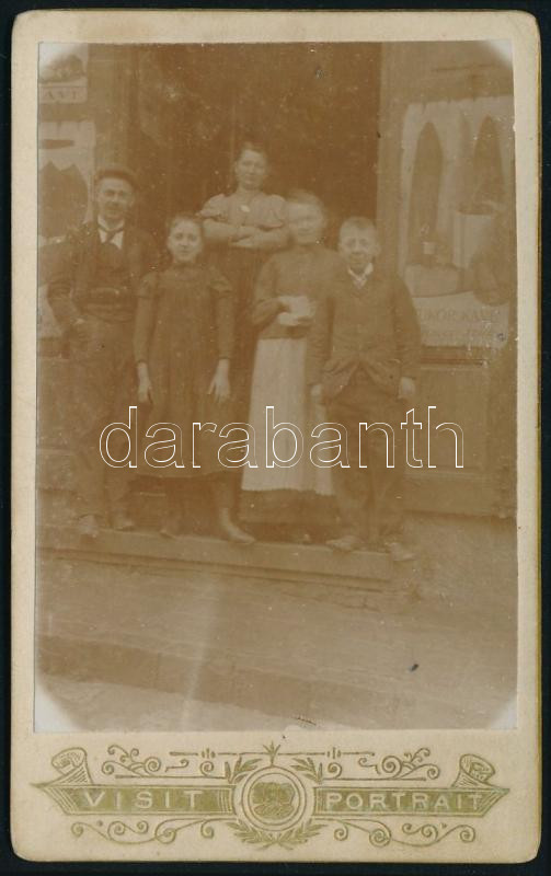 cca 1900-1910 Szatócsbolt bejárata előtt készült csoportkép, vizitkártya, érdekes szecessziós verzóval, 10,5x6,5 cm
