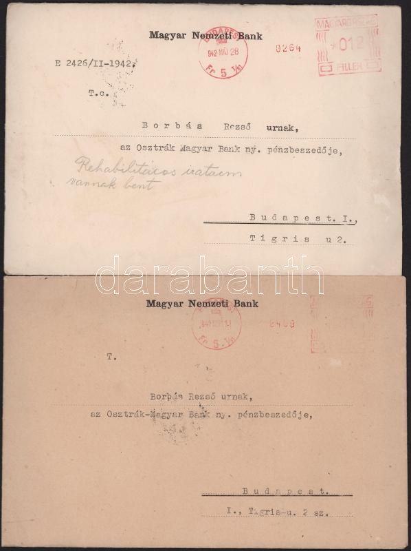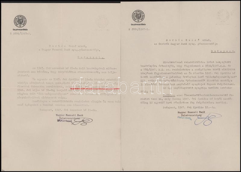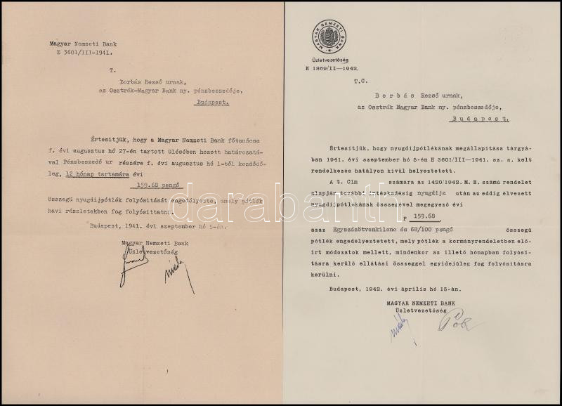 1931-1947 A Magyar Nemzeti Bank által Borbás Rezsőnek, az Osztrák-Magyar Bank nyugalmazott pénzbeszedőjének küldött hivatalos levelek, 6 db, két borítékban