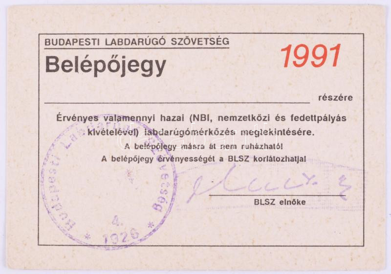 1991 Budapesti Labdarúgó szövetség által kiadott belépőjegy hazai mérkőzések megtekintésére