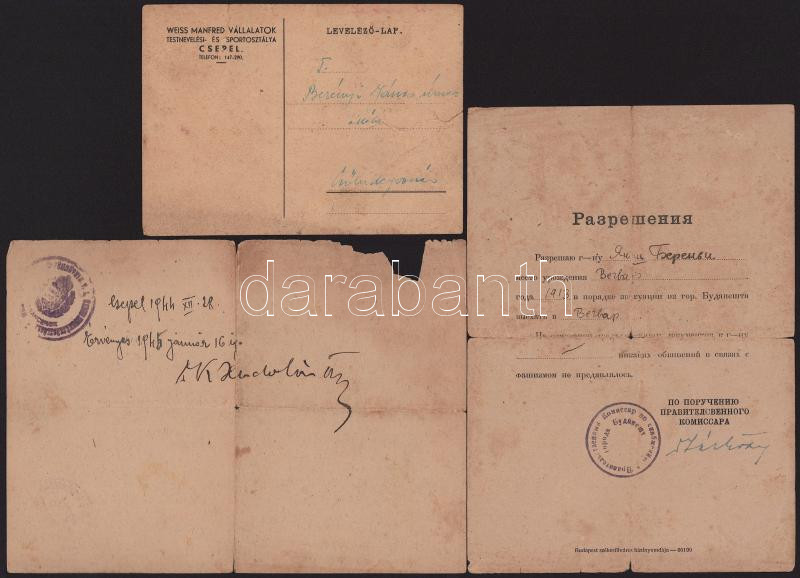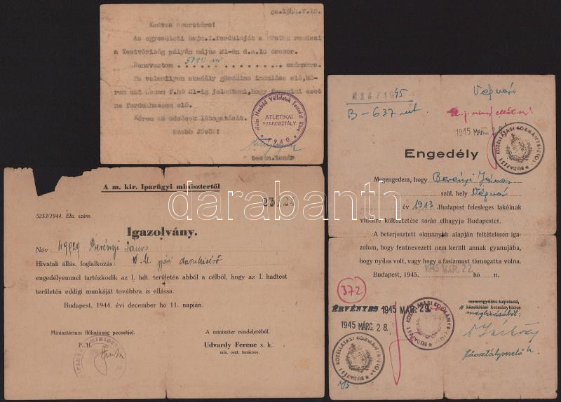 ca 1944 Weiss Manfréd gyár darukisérő tartózkodási engedély. + nevezés a Weiss Manfréd vállalt Atlétikai Szakosztályának 5000m. versenyére, Budapest elhagyási engedélye 1945. márc. 22.