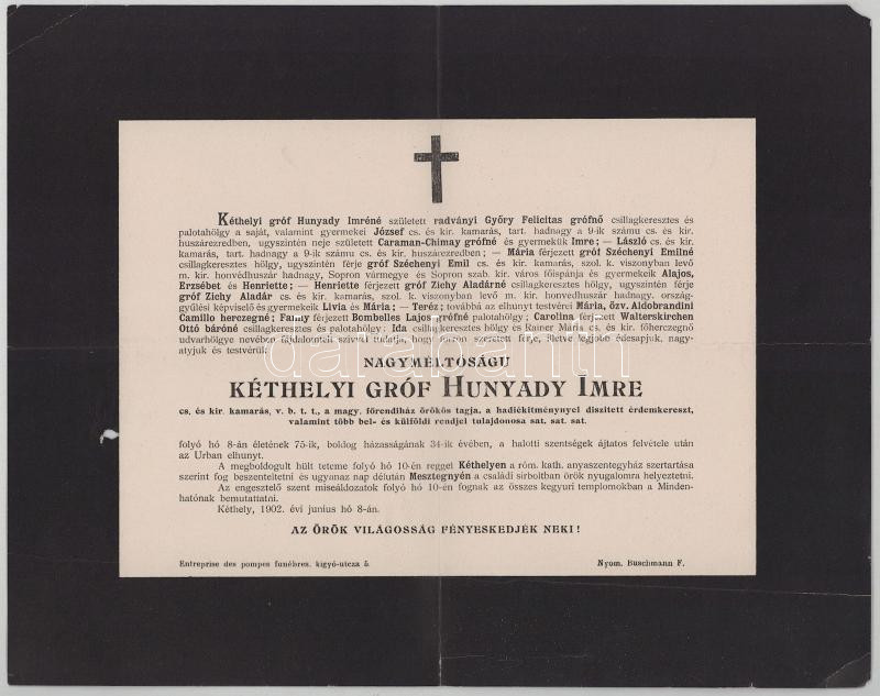 1902 Kéthely, kéthelyi gróf Hunyady Imre (1827-1902) cs. és kir. kamarás, titkos tanácsos, a Főrendiház örökös tagja halotti értesítője, kisebb sérülésekkel, 24x30 cm