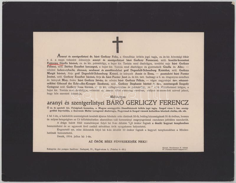 1914 Deszk, aranyi és szentgerlistyei báró Gerliczy Ferenc (1859-1914) cs. és kir. kamarás, országgyűlési képviselő, a Főrendiház örökös tagja, a Szuverén Máltai Lovagrend lovagja halotti értesítője, 24x31 cm