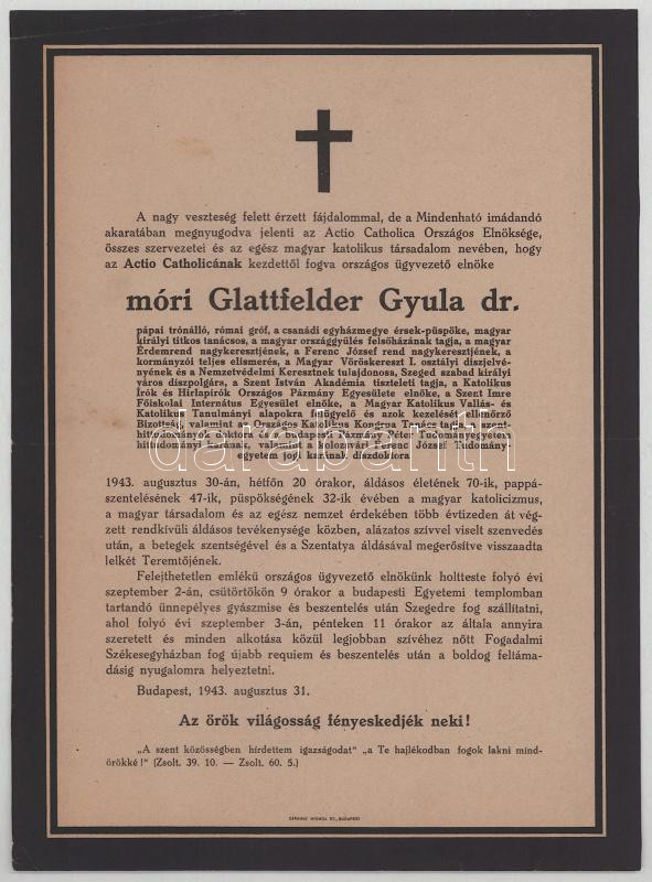 1943 Bp., móri Glattfelder Gyula (1874-1943) csanádi püspök, kalocsai érsek halotti értesítője, 25x18 cm
