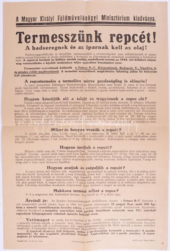 1944 "Termesszünk repcét! A hadseregnek és az iparnak kell az olaj!" - a Magyar Királyi Földművelésügyi Minisztérium kiadványa, hajtott, jó állapotban, 48×31 cm