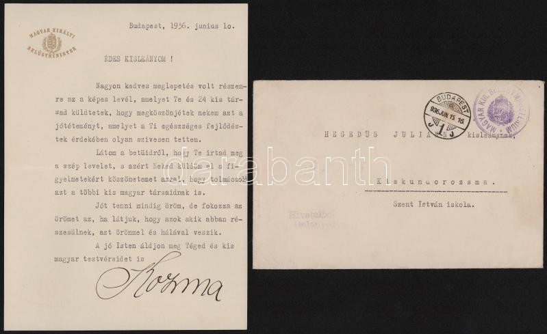 1936 Bp., vitéz leveldi Kozma Miklós (1884-1941) politikus, az MTI elnöke, belügyminiszter (1935-1937) autográf aláírásával ellátott, gépelt köszönő levele egy iskolás kislány részére, eredeti borítékkal