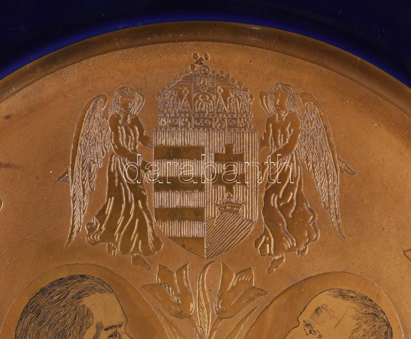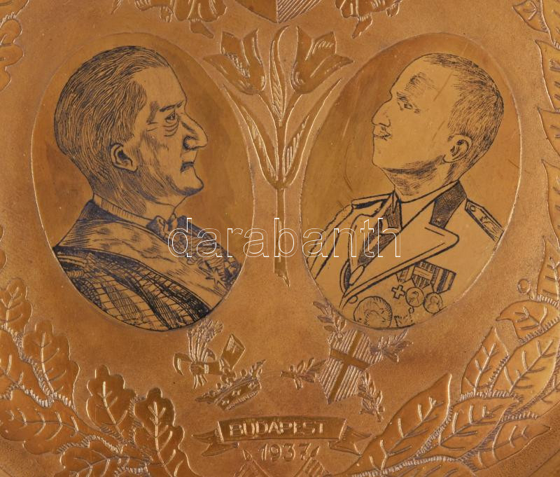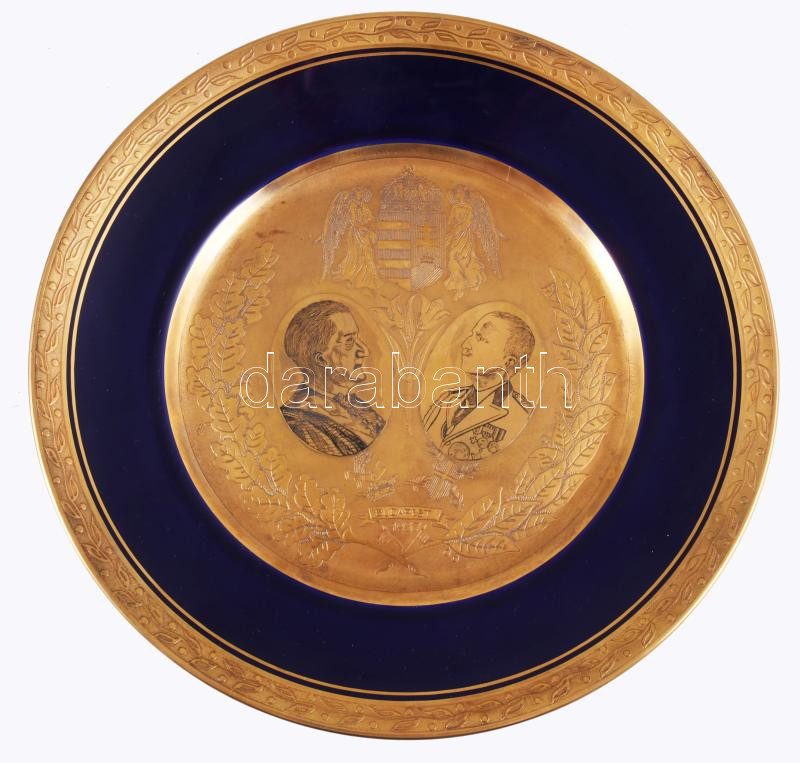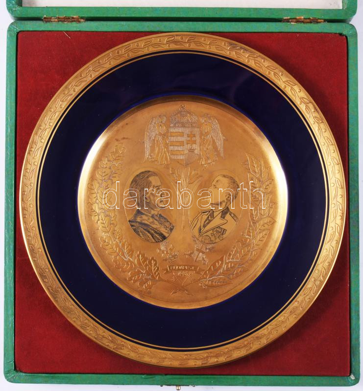 1937 Unique commemorative plate decorated with the portraits of King Emanuel III of Italy and Emperor of Ethiopia and Governor Miklós Horthy for Minister of National Defense Vilmos Rőder with a gift inscription The Italian porcelain plate was made for Vilmos Rőder in memory of the visit of King Emanuel III of Italy to Budapest. The gilded plate shows the Hungarian coat of arms, the Italian royal coat of arms and the Horthy family coat of arms next to the two portraits. With an inscription on the back. "In memory of His Majesty King Emanuel III of Italy, Emperor of Ethiopia, His Majesty the Minister of National Defense Vilmos Rőder in memory of the visit to Budapest" Gilded, hand-painted, d: 19.5 cm in a gift box.
