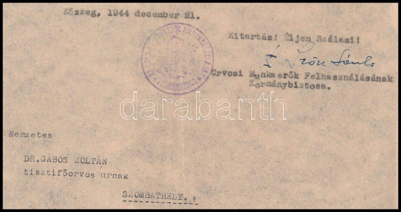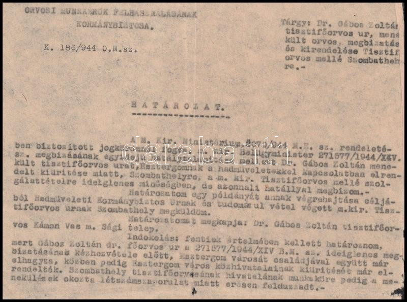 1944. dec. 21. Kőszeg, az Orvosi Munkaerők Felhasználásnak Kormánybiztosa határozata Dr. Gábos Zoltán menekült tisztifőorvos Szombathelyre való kirendeléséről, "Kitartás! Éljen Szálasi!" sorokkal és aláírással, kissé sérült