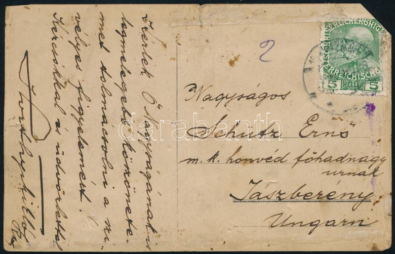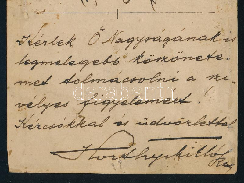 cca 1915 Horthy Miklós (1868-1957) által Schütz Ernő m. k. főhadnagynak küldött saját kézzel írt és aláírt fotólap, rajta I. Ferenc József cs. és király nagy társasággal körbevéve, sarokhiánnyal