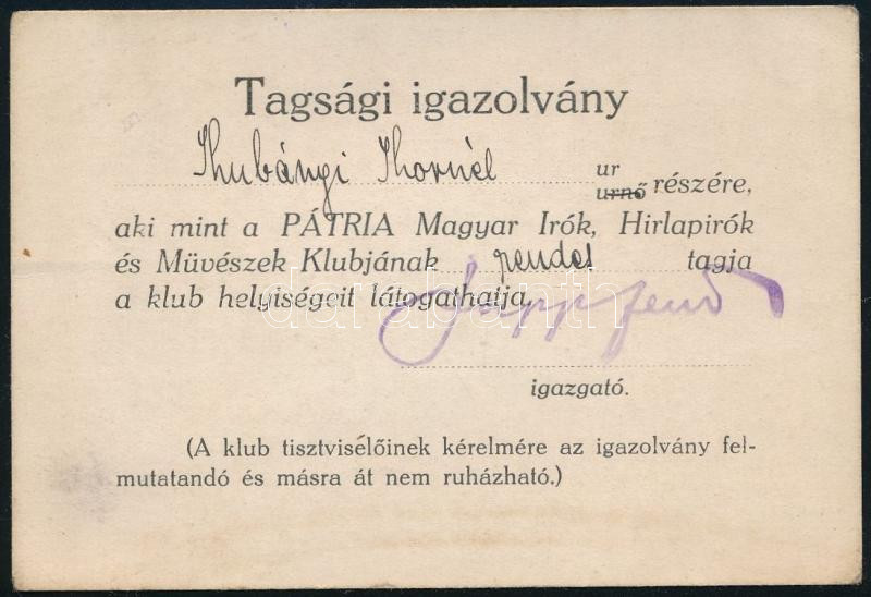 cca 1920-1930 vitéz hibbei és gyurinesszei Kubányi Kornél (1888-1969) a magyar külügyminisztérium sajtóreferensének "Pátria Magyar Írók, Hírlapírók és Művészek Klubjába" szóló tagsági igazolványa.