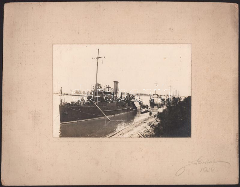 1929 A M. Kir. Honvéd Folyamőrség "Kőrös" iskolahajója (egykori aknászhajó), kartonra kasírozott fotó, jelzett, 11x16,5 cm, karton: 22x28 cm