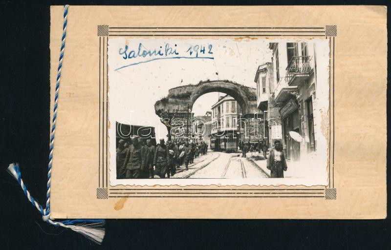 1942 Szaloniki (Görögország), német nyelven írt fényképes üdvözlőlap, a fotón villamos mellett vonuló katonákkal