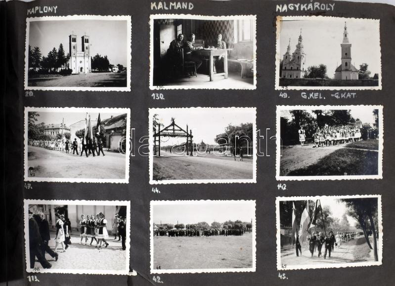 cca 1940-1942 Régi fotóalbum, főként az erdélyi bevonulás képeivel (Nagykároly, Beszterce, Kolozsvár, Zilah, Kraszna, Varsolc, Szilváspatak, Vállaj, Kálmánd, stb.), kevés családi fotóval is, főként 6,5×9 cm-es méretben